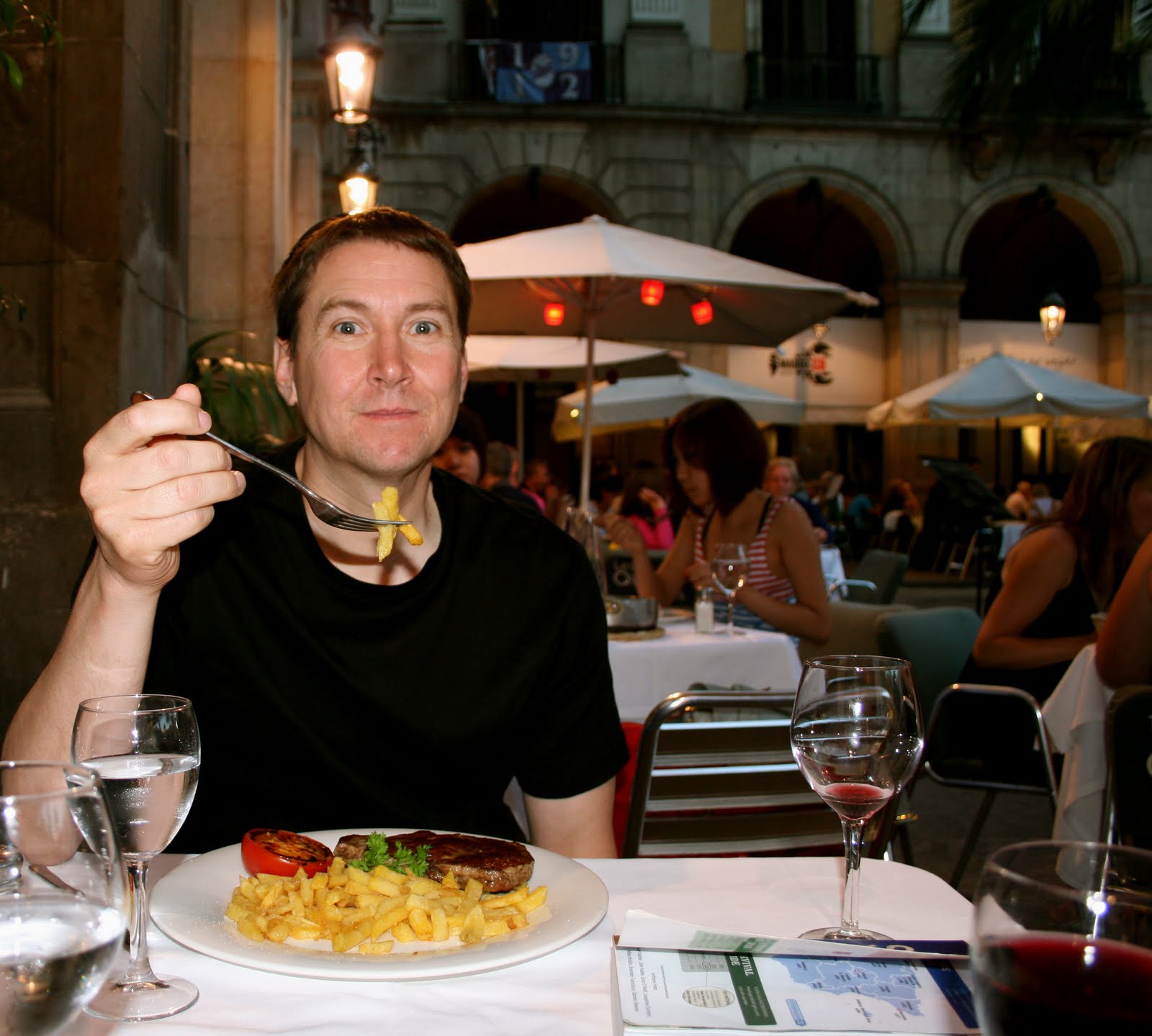 Line up to eat at Les Quinze Nits in the Placa Reial. Can you spot Peter?